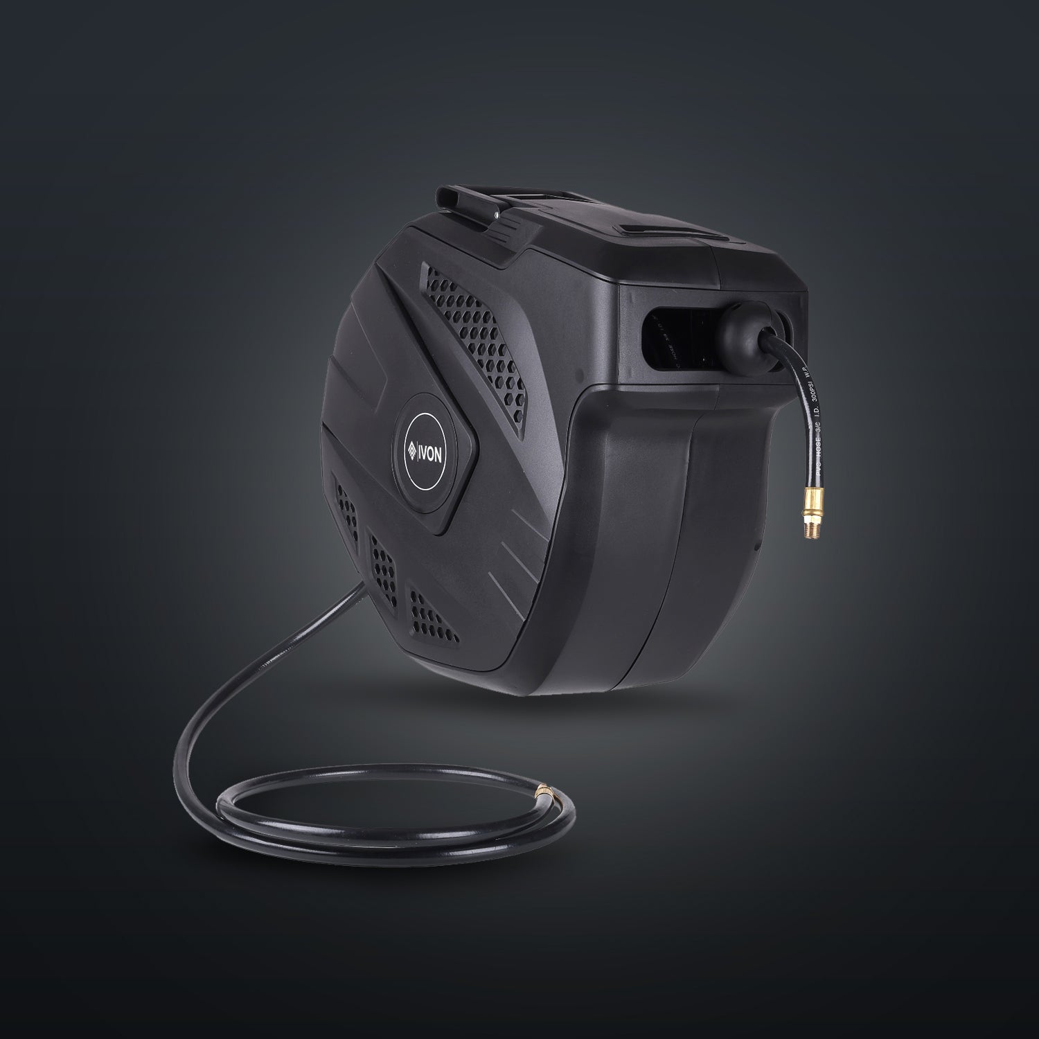 Our wall-mounted compressor hose with automatic rewind is the perfect solution for an organized and functional garage. With 15 meters of compressor hose, a powerful spring mechanism and a swivel wall mount, you get both flexibility and agility, as well as a black stylish design that will last.