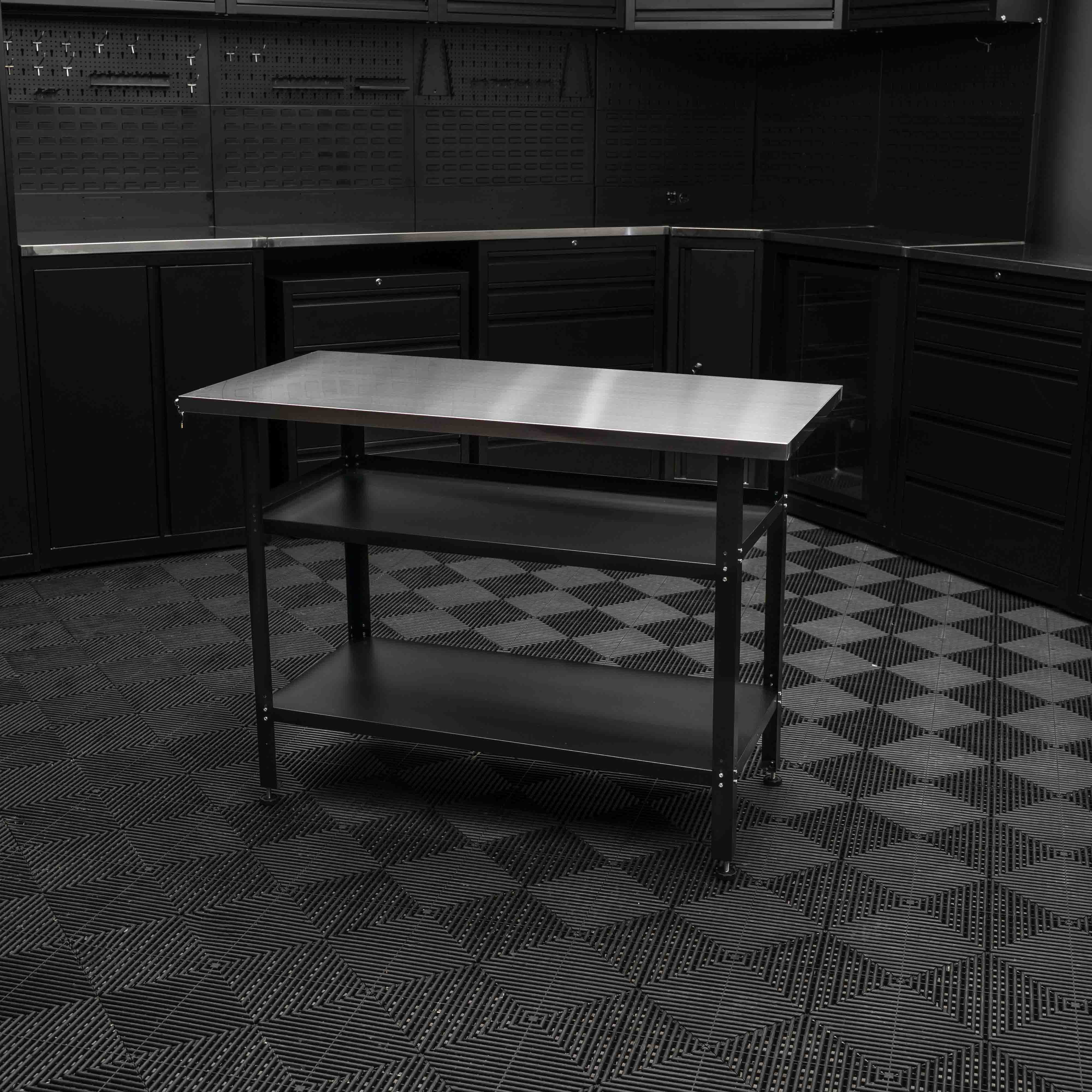 A compact but sturdy workbench for those who want an organized workspace even in smaller spaces. Perfect for hobby projects, small workshop work or practical tasks in the garage. The three shelves provide plenty of space for tools, materials and equipment, so you always have what you need close at hand. Adjustable feet ensure that the table stands stable even on uneven floors.