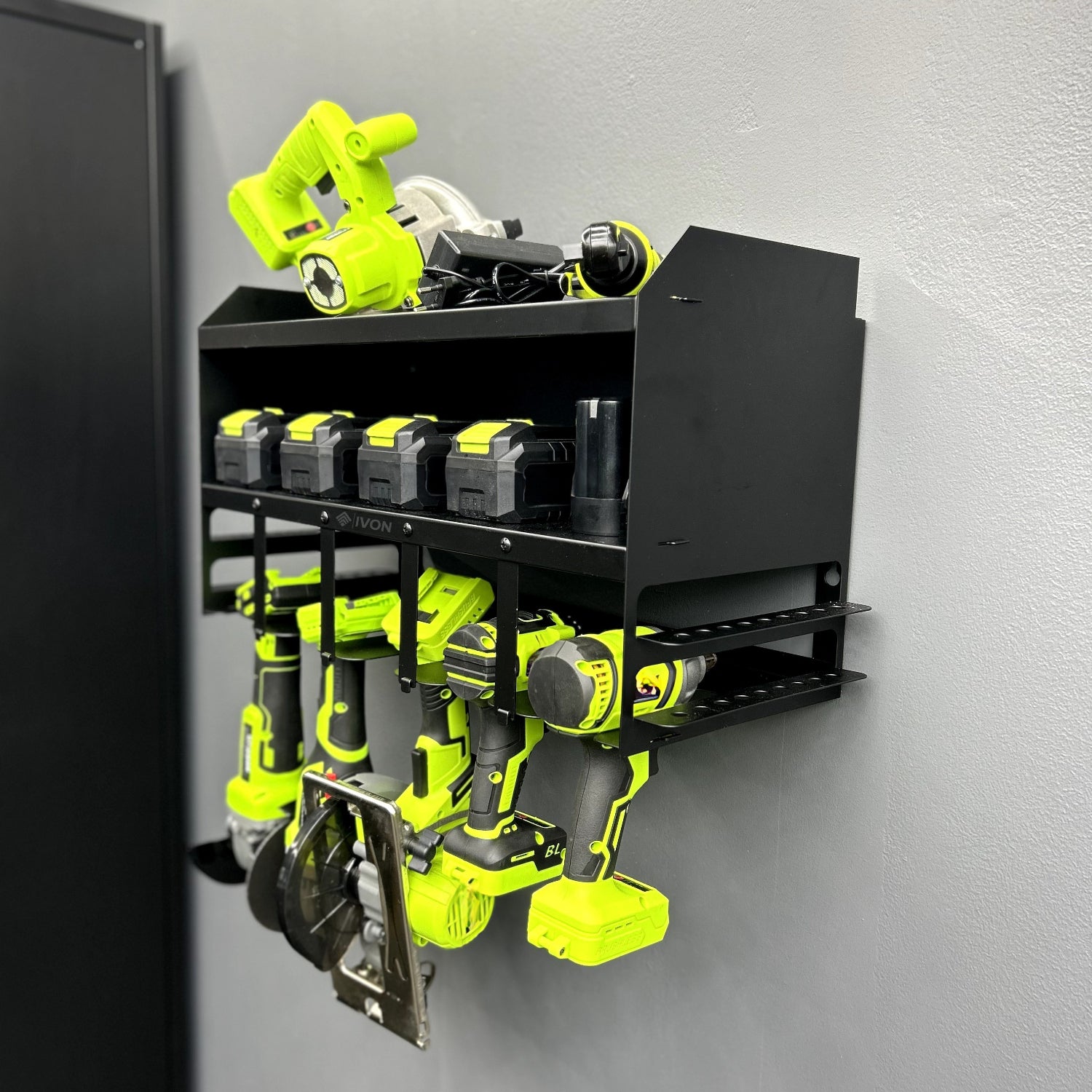 Exclusive organization for your tools. Elevate your workspace with a storage solution that combines function, aesthetics and quality. Our robust storage shelf for cordless tools is designed for those who value both style and structure – whether you are a DIYer or a professional.