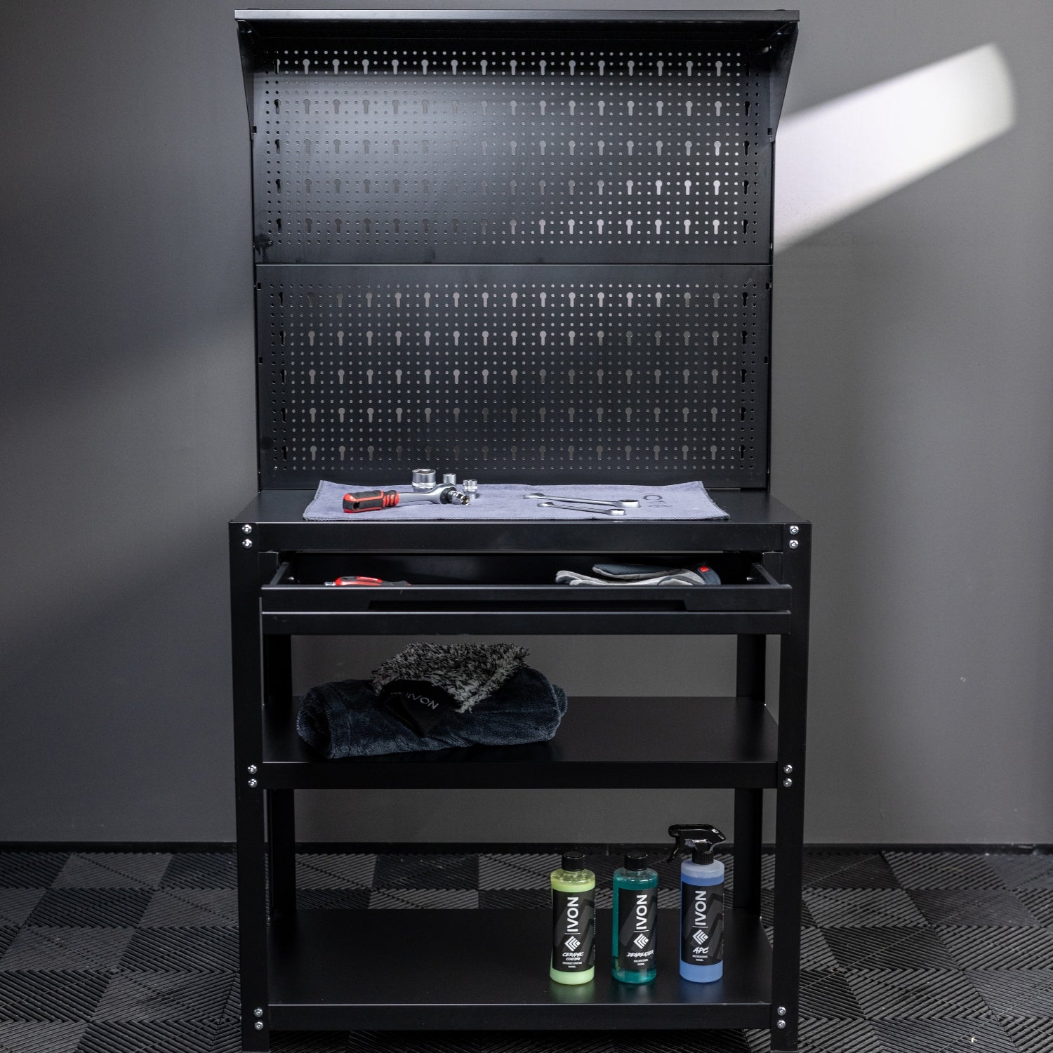 Robust workbench with three shelves, drawer and integrated tool board - a complete and stylish solution in our Black Series.