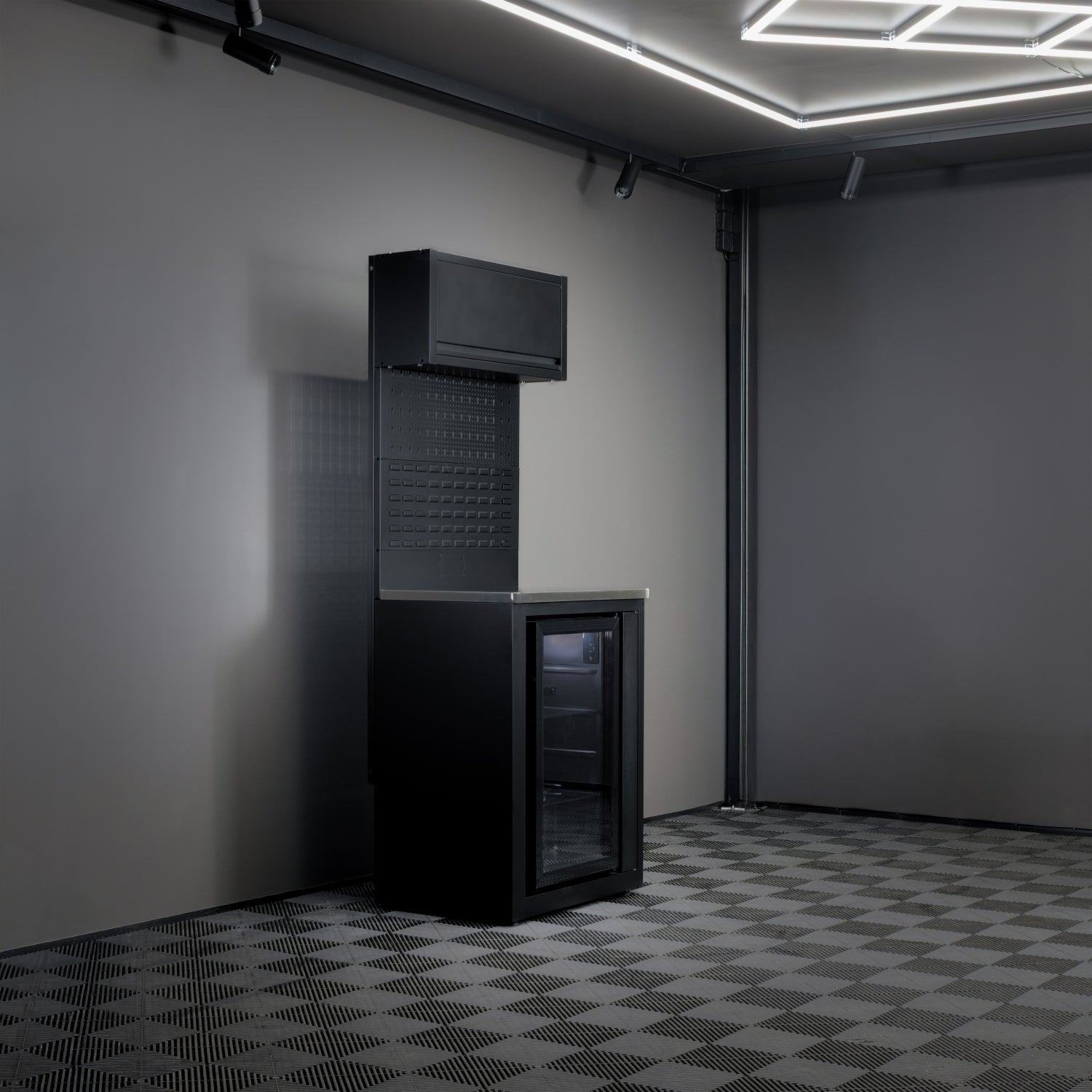 For those who know that the best things happen in the garage. With the IVON Black Series refrigerator module you don't just create order, you create an experience. Includes a stainless steel countertop, tool board with standard accessories and a top cabinet with gas spring closure.