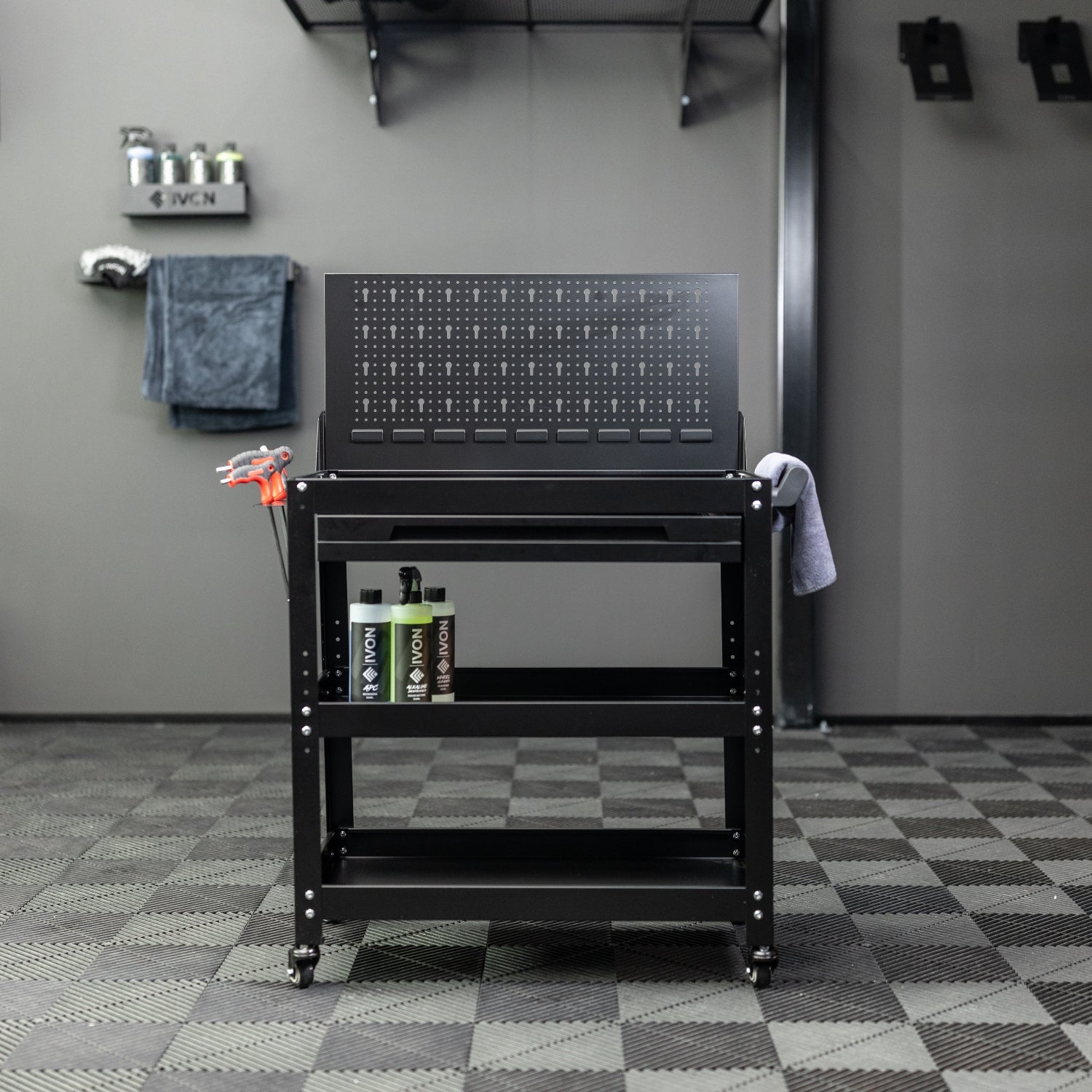 Robust workshop trolley with three shelves, drawer and integrated tool board - a complete and stylish solution in our Black Series.