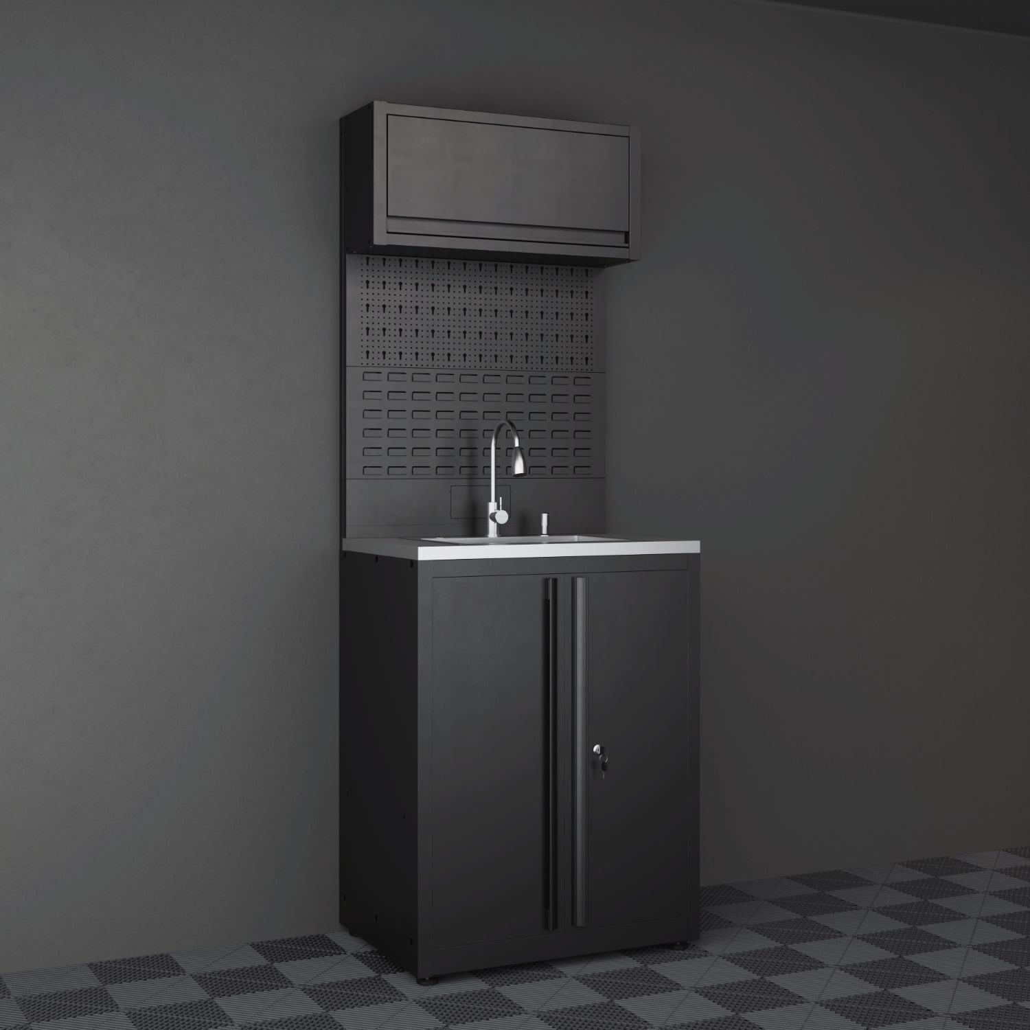 For those who know that the best things happen in the garage. With the IVON Black Series sink module you create order and order by enabling easy cleaning. Contains a stainless steel worktop, stainless steel sink, chrome mixer tap, tool board with standard accessories and a top cabinet with gas spring closure.