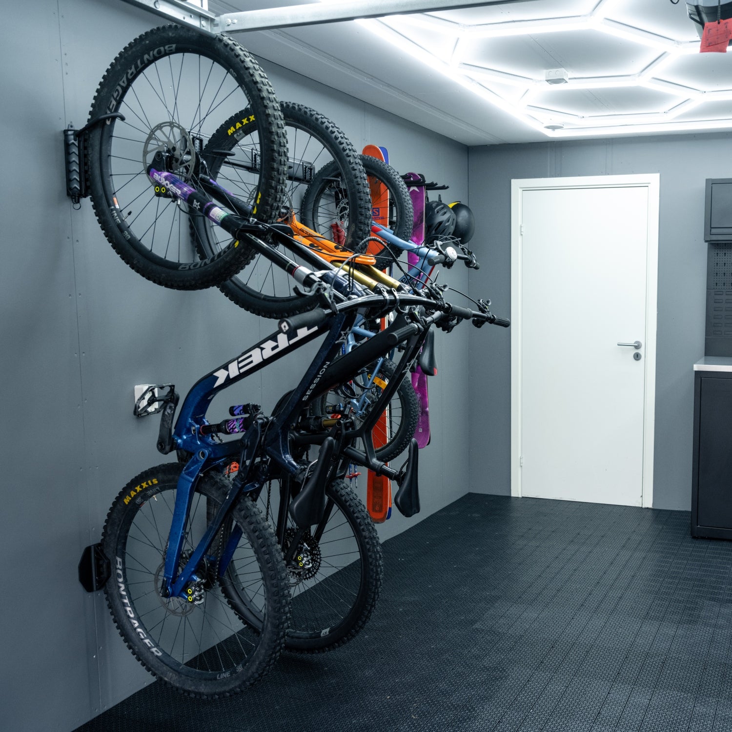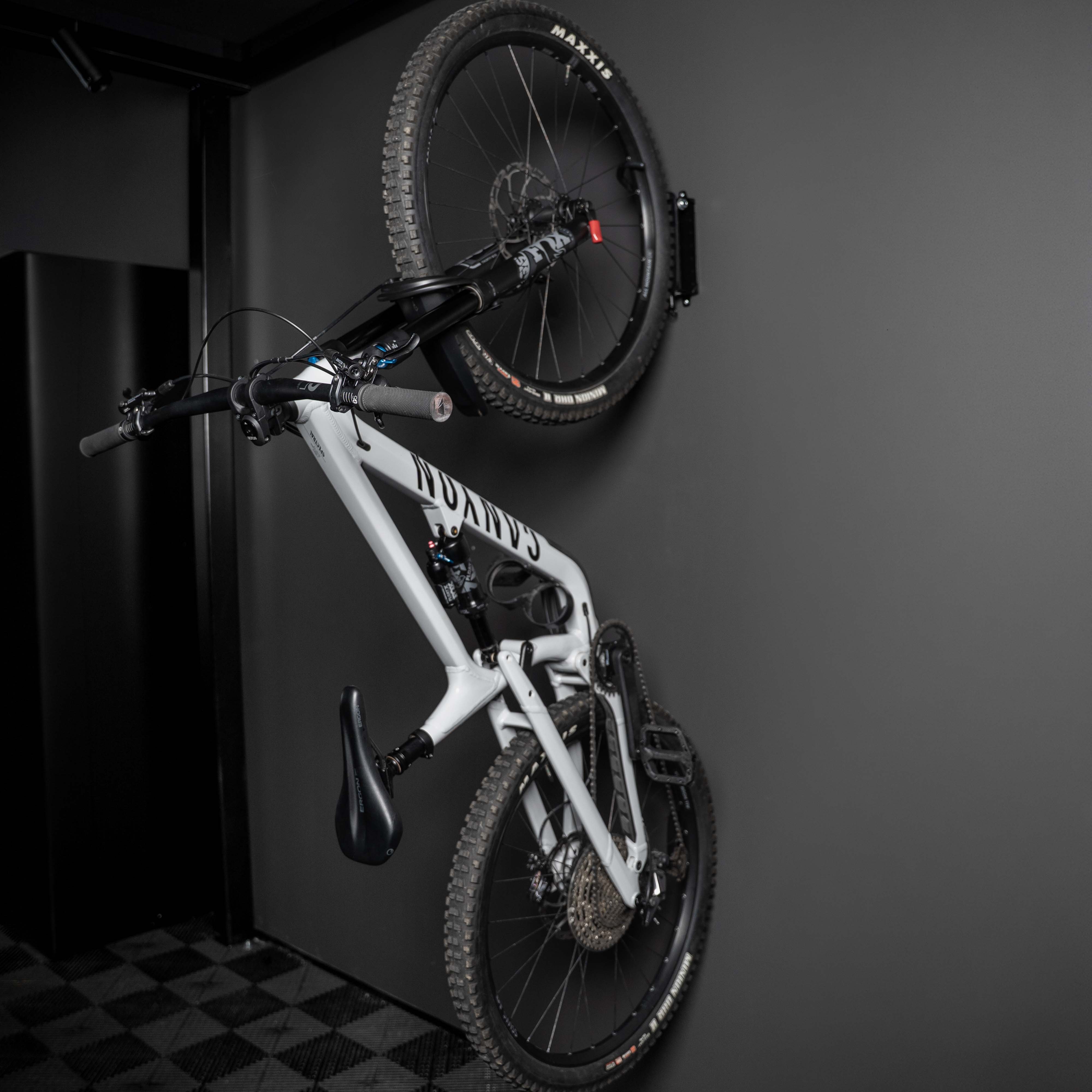 Bike rack with 180 degree swivel function that optimizes space in your garage. Comes with a heel for the rear wheel to avoid damage to the wall.