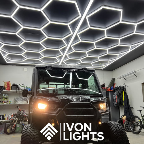 Give your garage a lift with IVON® Hexagon lighting. With a modern honeycomb pattern and crystal clear light with a color temperature of 6000K, our LED fixture creates an exclusive and functional environment. Customizable size and easy installation make it easy to tailor the light to your garage. Experience a WOW feeling every time you open the garage door.
