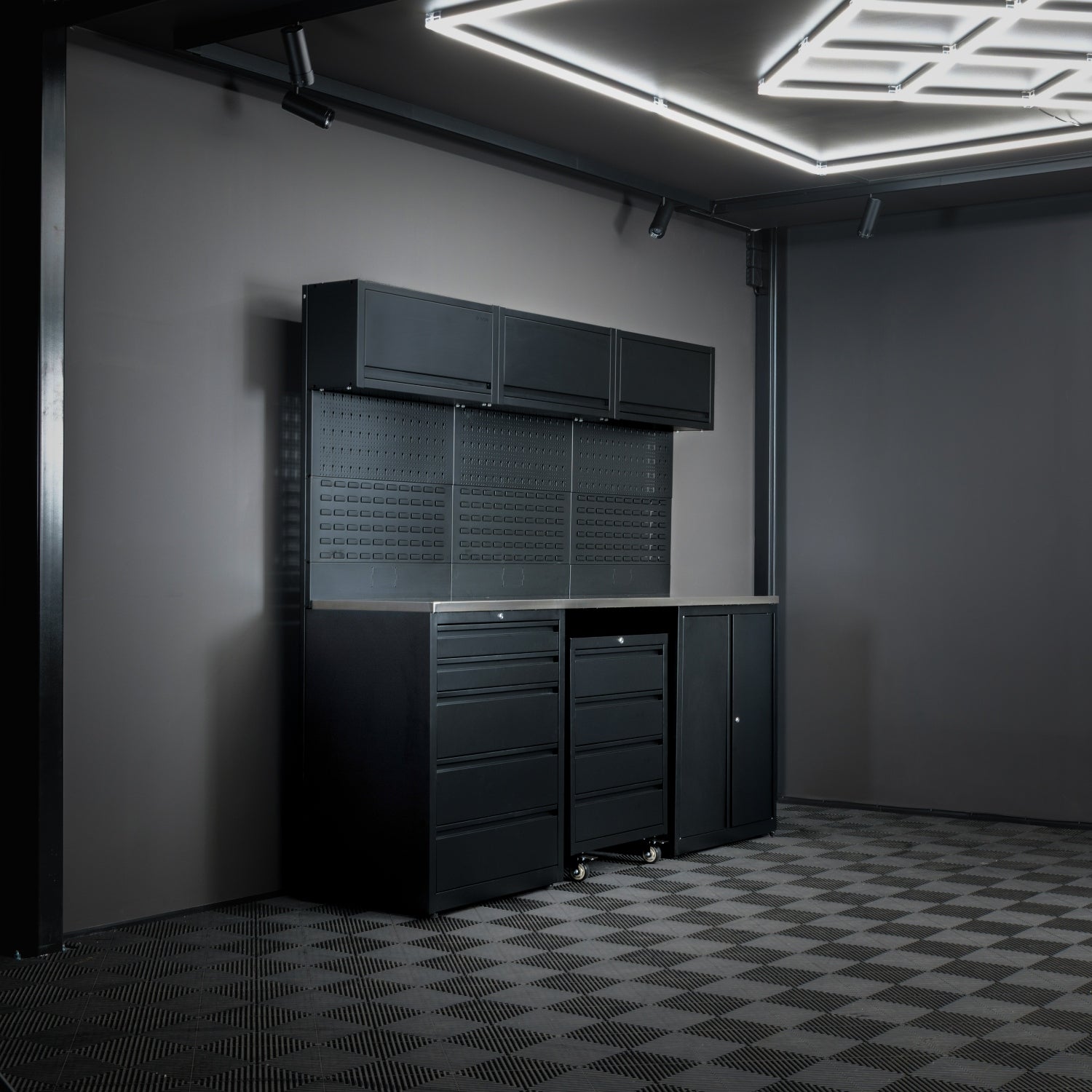 En garageinredning som förvandlar din arbetsplats till ett showroom av precision och stil. Den rostfria bänkskivan ger en robust och exklusiv känsla, medan mattsvart lack skapar ett modernt, sofistikerat uttryck. Diskreta logotyper understryker ren design, och gasdämpade överskåp öppnar sig med mjuk och kontrollerad rörelse. Här möts funktion och estetik i perfekt balans, för dig som kräver mer än bara förvaring.