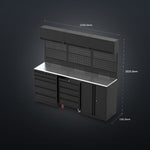 Our second smallest garage interior, which despite its size (225 cm width) gives an incredibly luxurious look in the small space. Contains a stainless steel worktop, tool board with standard accessories, ball-bearing soft-close drawers and substantial storage options.