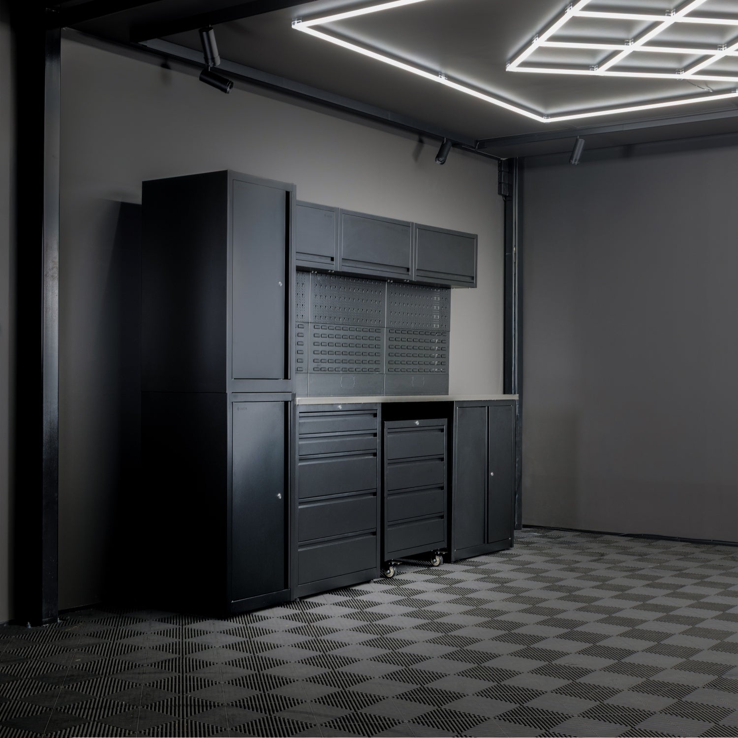 Complete interior package perfectly adapted for the smaller garage. Includes stainless steel worktop, tool board with standard accessories, ball-bearing drawers and sturdy storage shelves in the tall cabinet.