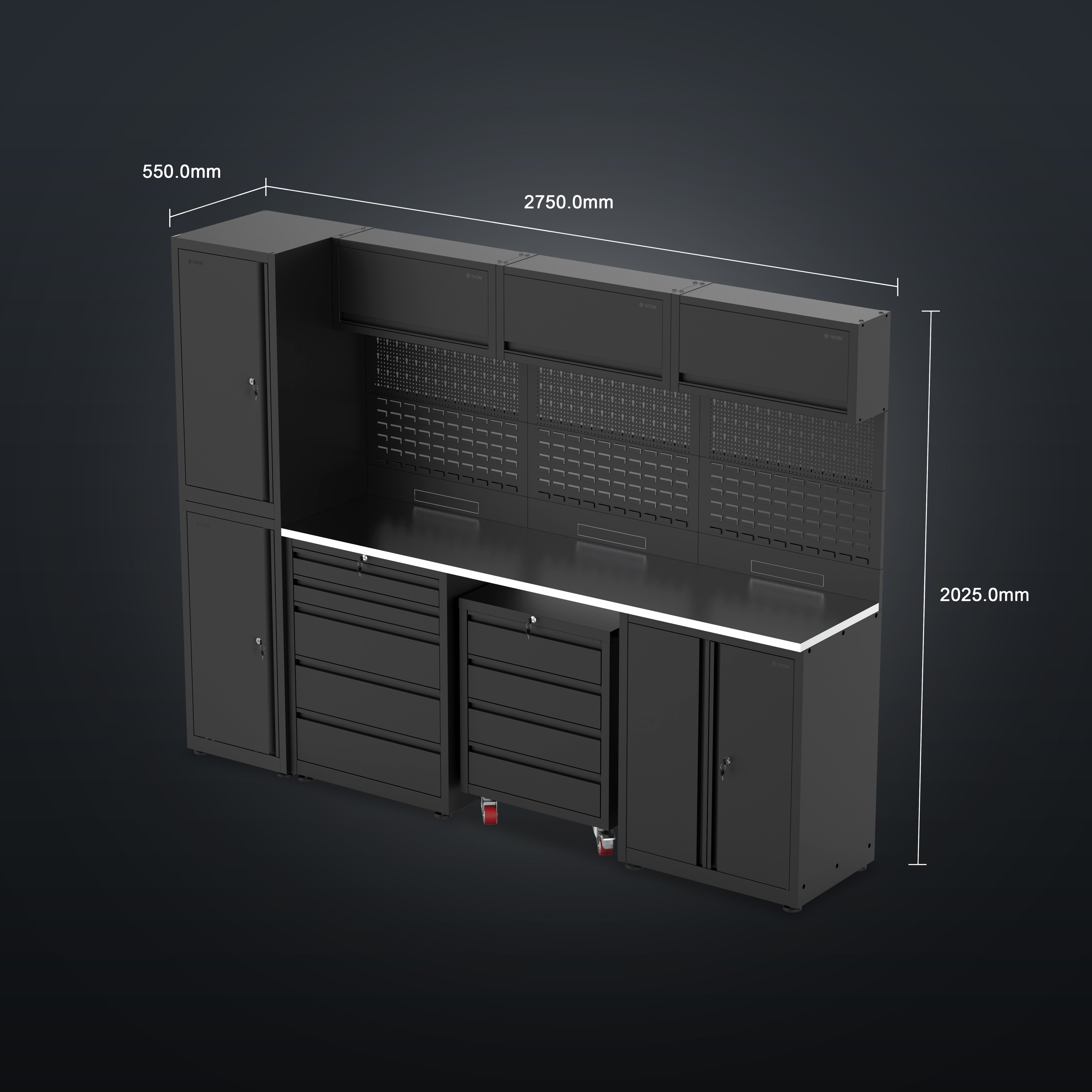 Complete interior package perfectly adapted for the smaller garage. Includes stainless steel worktop, tool board with standard accessories, ball-bearing drawers and sturdy storage shelves in the tall cabinet.