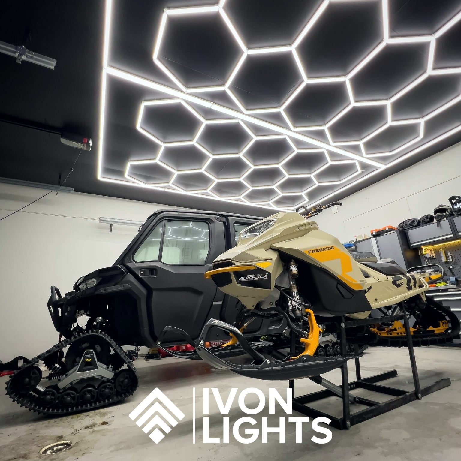 IVON LIGHTS Hexagon lighting (LED fixture) takes your garage to a whole new level, both in design and function. Our highly efficient LED luminaire with honeycomb pattern provides a smoother and better light flow compared to traditional fluorescent tubes. Normal lighting has a color temperature of 3000 Kelvin, while our lighting has a color temperature of 5000 Kelvin. This gives you a warm white glow, which both keeps your body more alert and makes the white surfaces in the garage really appear white. The size is fully adjustable and the loop can easily be both shortened and lengthened without problems (see separate spare parts). If you want to add both appearance and function to your garage, combined with a real WOW feeling, this is the product for you.