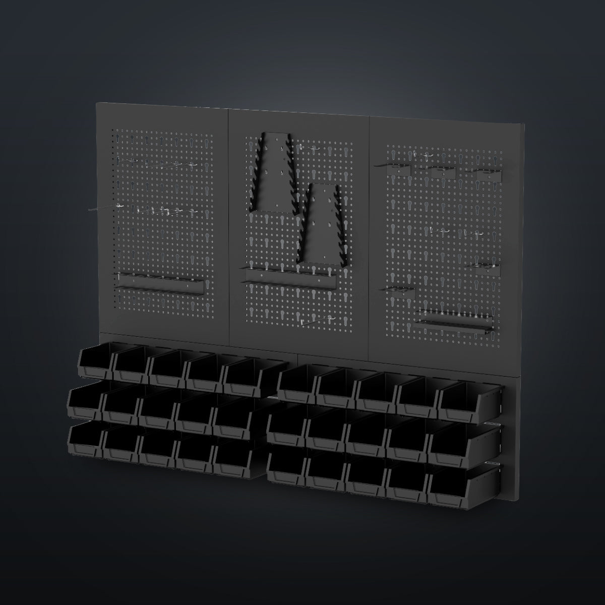 Stylish and practical storage of tools as well as screws, bolts, nuts and other small things. The package includes 20 large + 10 small assortment boxes, holders for block keys and various universal hooks for tools of your choice.