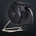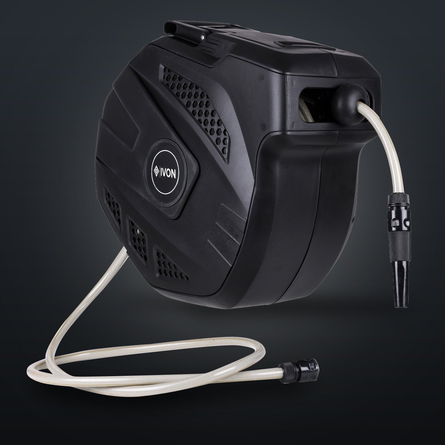 Our wall-mounted water hose reel with automatic rewind combines a sleek black design with superior functionality. The advanced mechanism provides smooth, tangle-free use, while the 180° swivel bracket provides maximum flexibility. Easy installation and a premium feel, perfect for those who don't want to compromise on aesthetics or convenience.