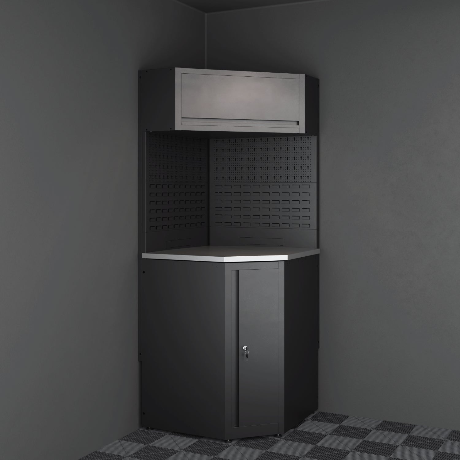 Snyggt och praktiskt hörnskåp med bänkskiva av rostfritt stål. en garageinredning i premiumklass för dig som vill kombinera funktion med exklusiv design.
