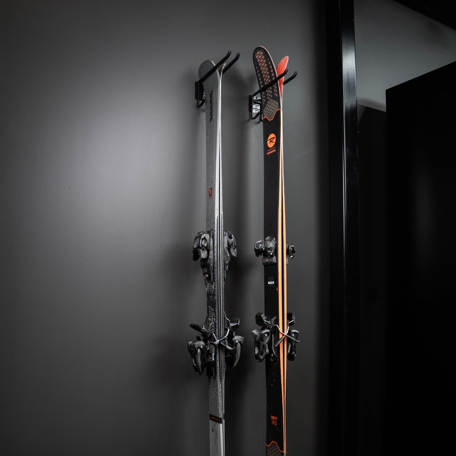 2 st gummibeklädda skidhållare med krokar för direktmontage i vägg. Levereras komplett med skruv och plugg för standardmontage.